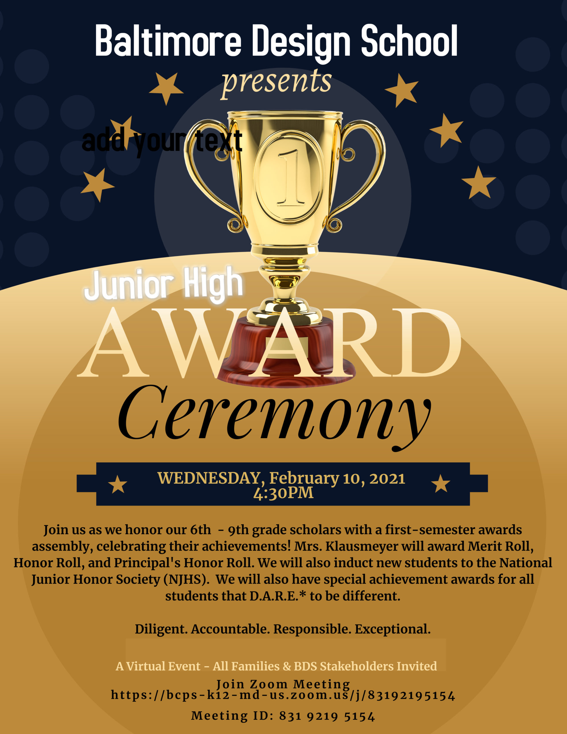 View All Events Events Wednesday, February 10th, 2021 Join us for the 1st Semester Achievement Award Ceremony for our scholars in grades 6 – 9 (All BDS Stakeholders welcome!!) February 10 @ 4:30PM Date and Time Wednesday, February 10th, 20214:30 pm Register Previous Post Dr. G from Johns Hopkins' 'Medicine for the Greater Good' talks with the BDS community about COVID safety and the vaccine - Feb. 17 @ 3:30pm Next Post 12th Grade Families: Update on In-Person Learning - Monday, Feb. 8, 2021 @ 5:30 (Virtual Meeting)