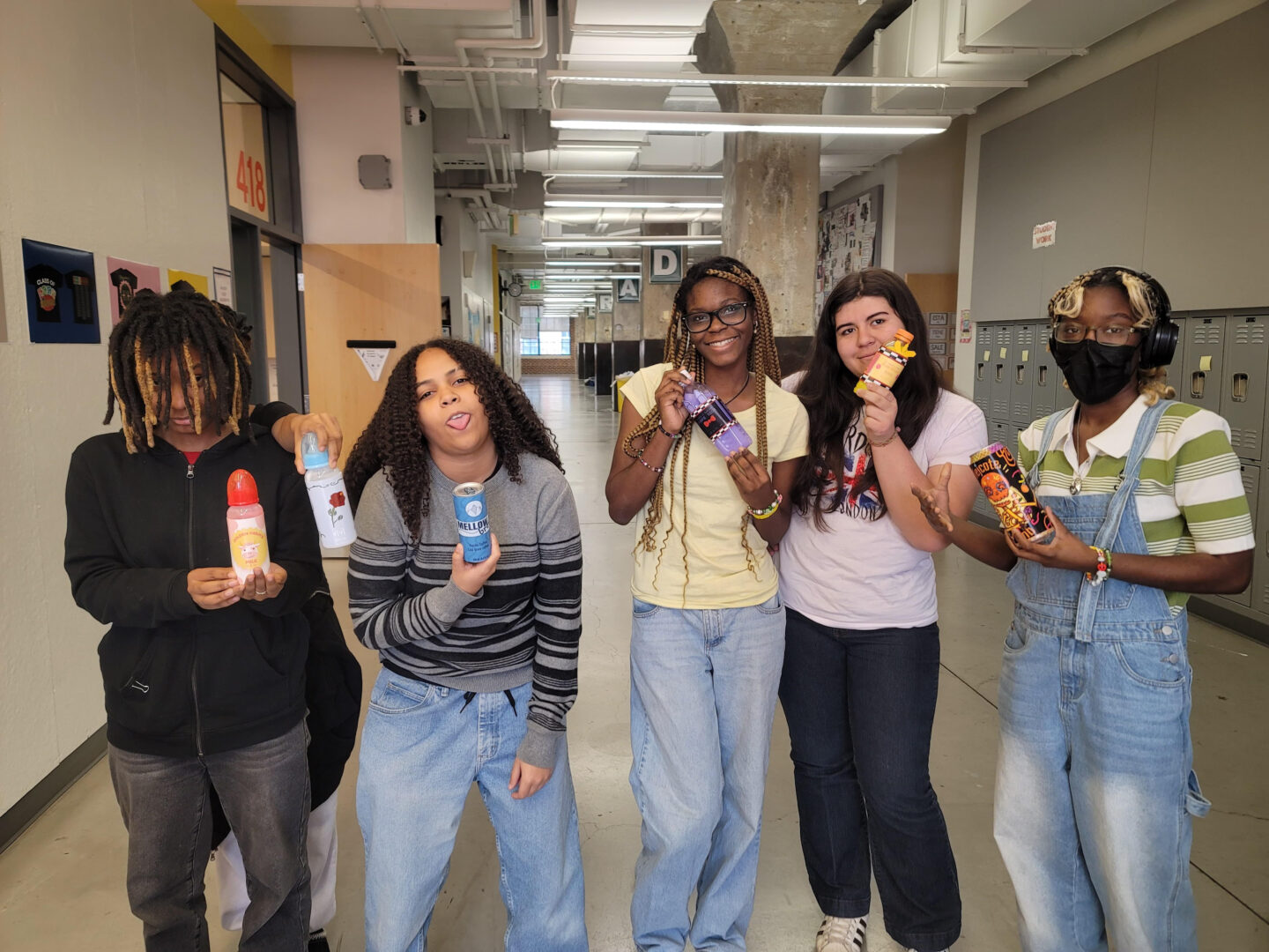 In Mx. De La Cruz’s Graphic Design class, students are learning about color theory by producing two different flavors for an imaginary drink. Students measure recycled plastic and glass to accurately make their own realistic drink labels!